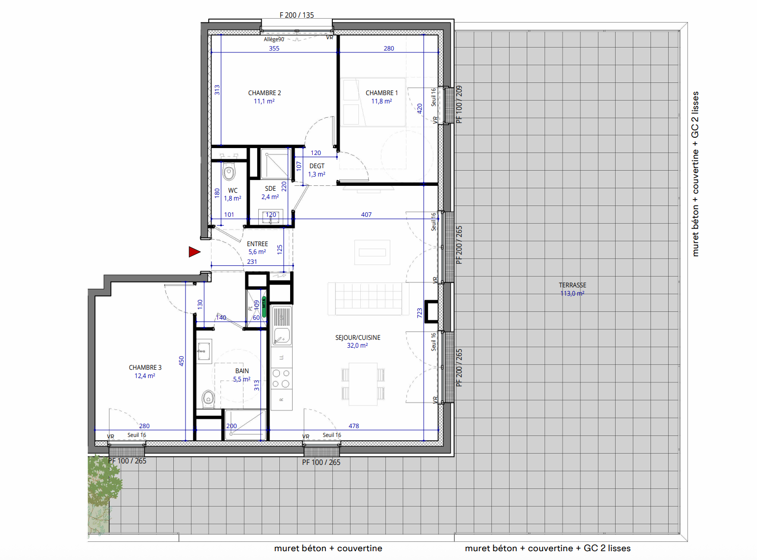 Il se compose d’une entrée avec placard, d’une belle pièce de vie de 32 m² avec cuisine ouverte et triple accès à la terrasse, d’un WC séparé, de 2 salles de douche, et de 3 chambres.