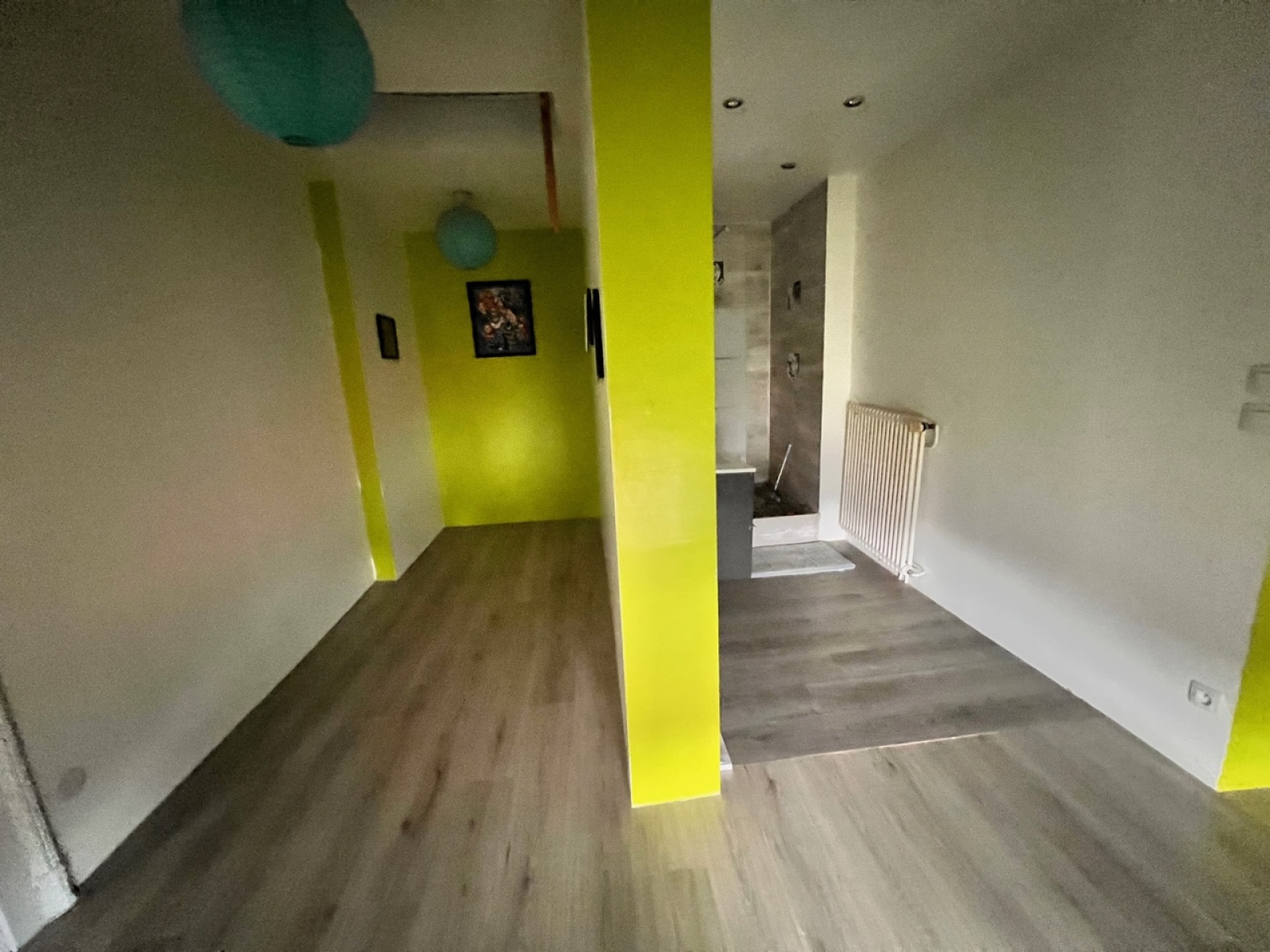 Entrée accueillante donnant sur une cuisine ouverte, lumineuse et conviviale,